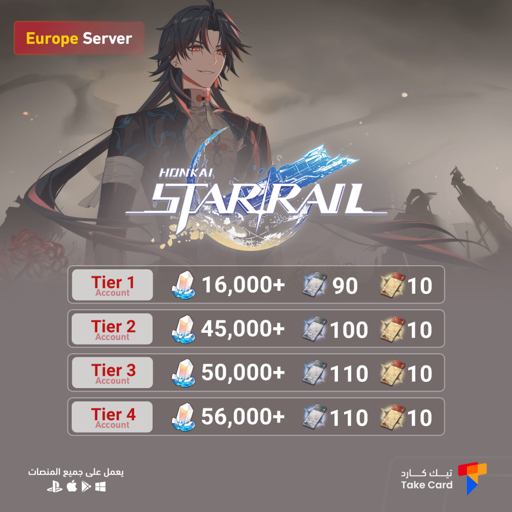 هذا العرض لحساب Honkai: Star Rail يحتوي على عدد من Stellar Jades والتذاكر كما هو موضح في صورة المنتج.